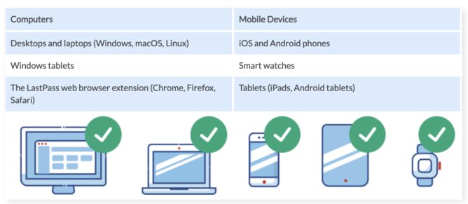 LastPass 共提供了两种设备类型的访问权限,即计算机(包括台式机和笔记本电脑上运行的所有浏览器)或移动设备(包括手机、智能手表和平板电脑)。从 2021 年 3 月 16 日开始,LastPass Free(免费版)用户仅能在一种类型的设备上访问 LastPass 。