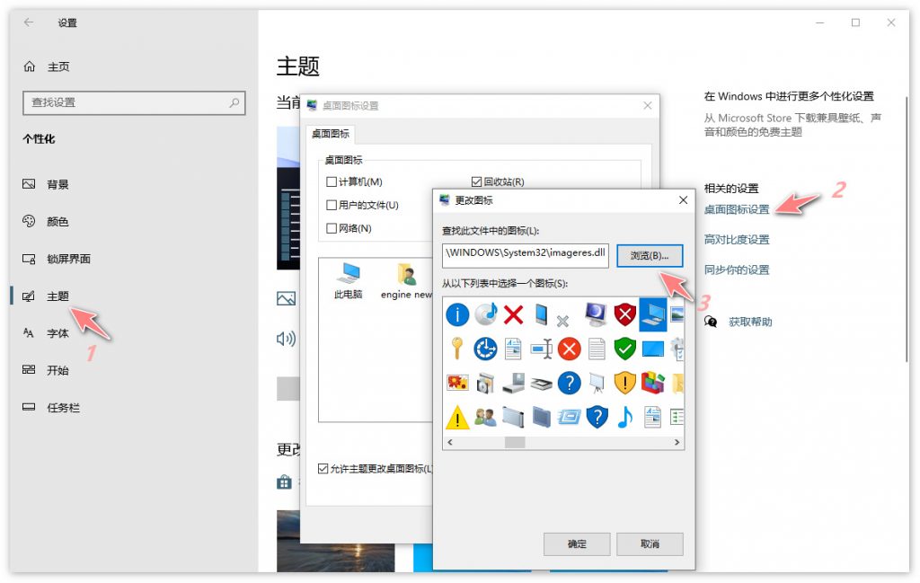 - 选择设置 – 个性化 – 主题 – 桌面图标设置