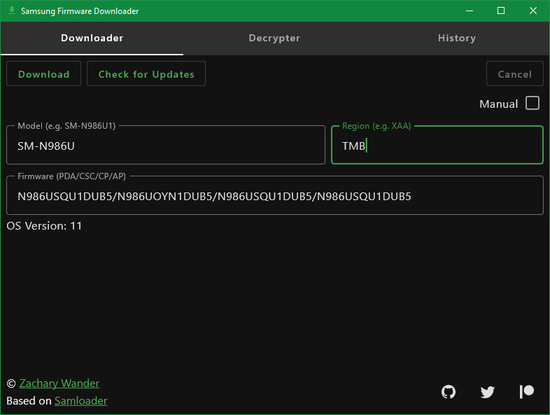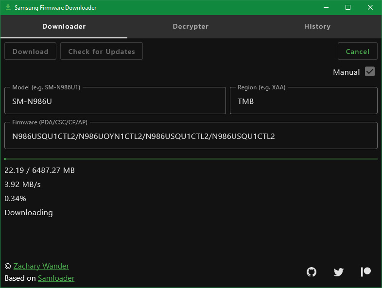 严格地说,Samsung Firmware Downloader 是一个 GUI,它实际上基于 Samloader 开发。 Samloader 是一个可以在安装了 Python 3 的设备上运行的命令行程序,可帮助用户检查三星设备的最新更新、下载更新包,甚至解密已经下载的更新包。