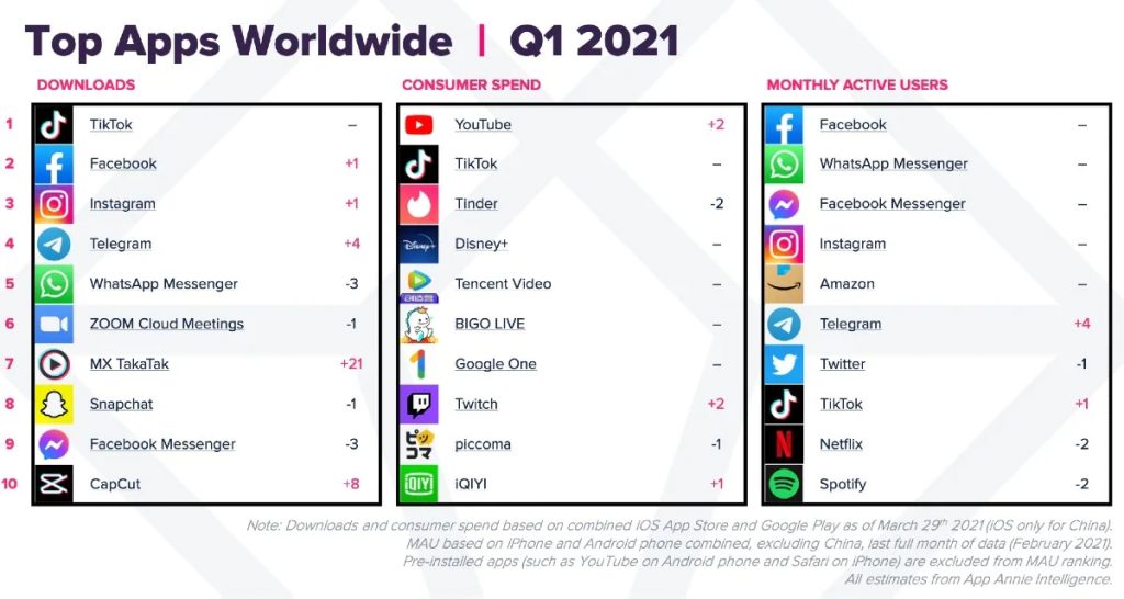 从应用来看,在 2021 年第一季度,App Store 和 Google Play 上下载量、消费支出和月活用户(MAU)的头榜分别是 TikTok 、 YouTube 和 Facebook 。(下图)