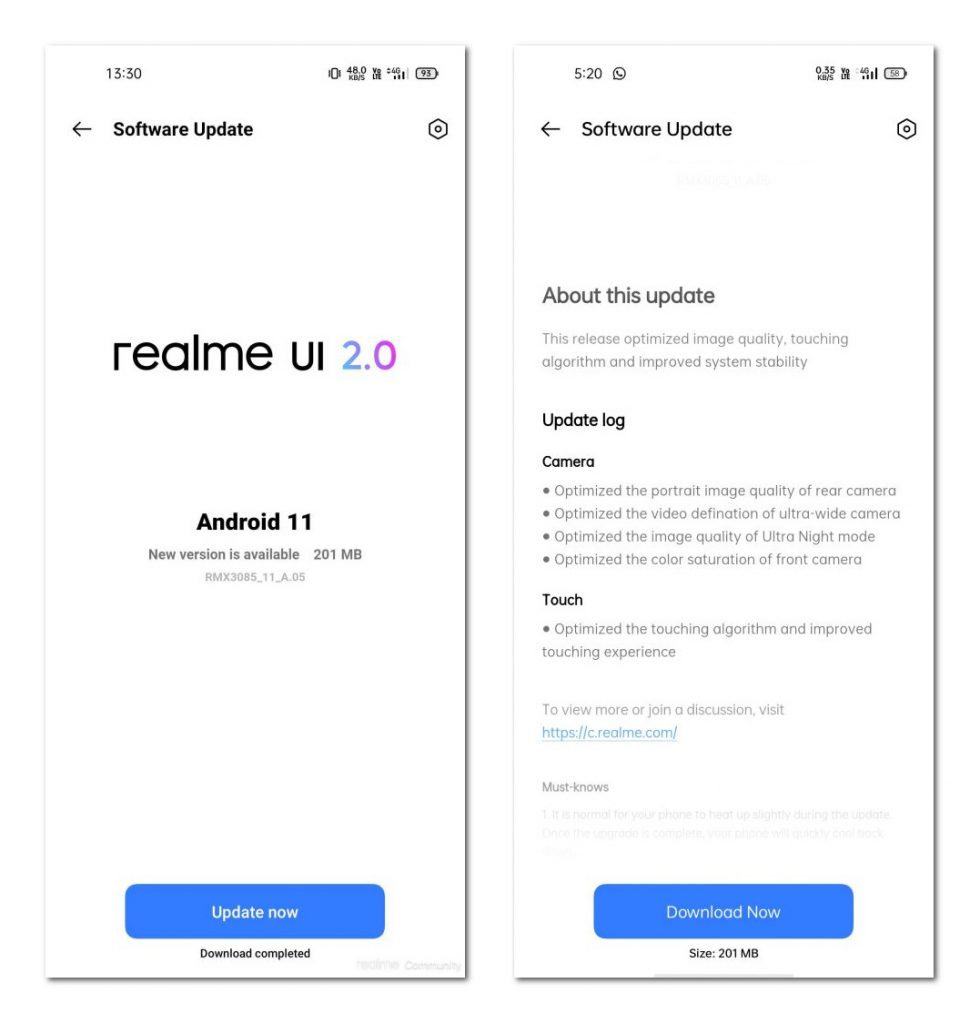 本次更新固件版本为 RMX3085_11_A.05,大小为 201MB 。