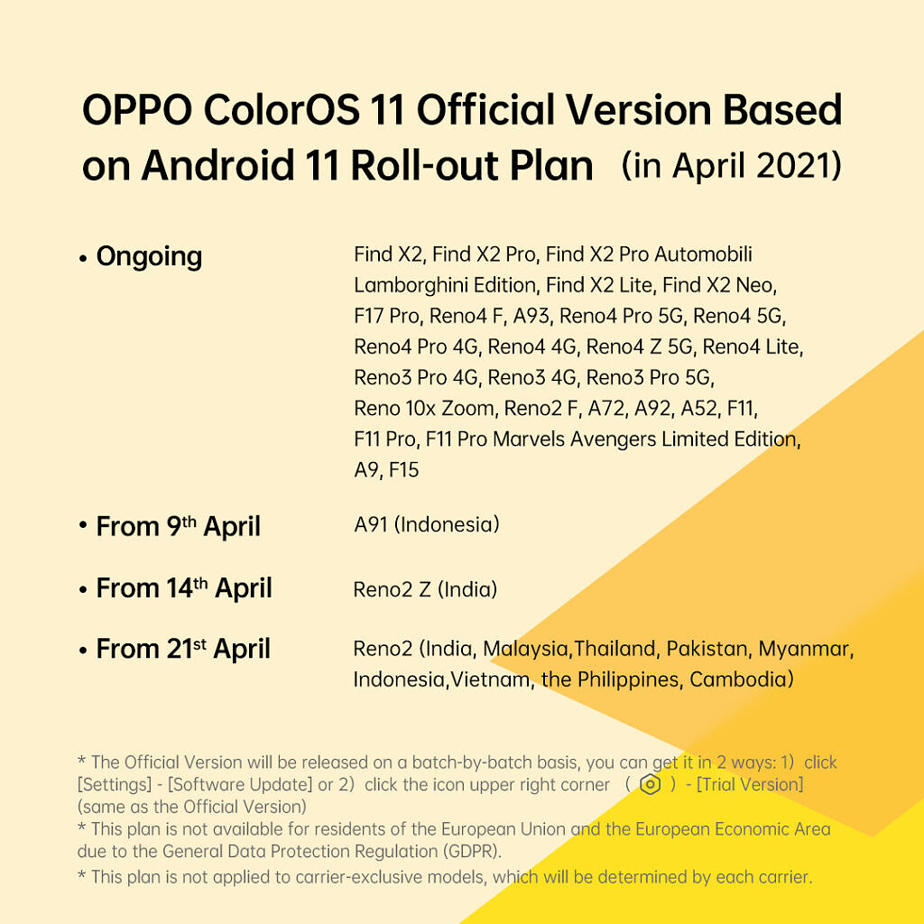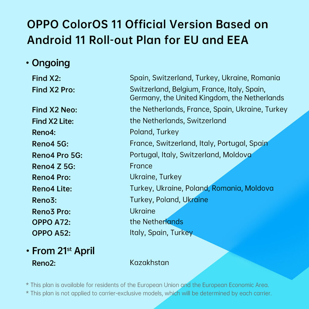 最后,OPPO 还共享了在欧洲和欧洲经济区正在部署的 ColorOS 11 稳定版的最新信息。目前 OPPO 正向 OPPO Find X2 系列、 Reno 4 、 Reno 4 系列、 Reno 3 、 Reno 3 Pro 、 A72 和 A52 推出 ColorOS 11 稳定版更新。同时,将于 4 月 21 日开始向 Reno 2 推出更新。