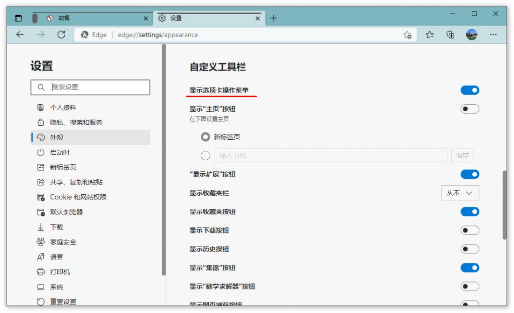 这个开关默认为开启状态,它用于控制是否在 Edge 浏览器上显示 “标签页操作菜单” 。如下图示。