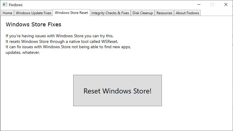 除此之外,Fixdows 还支持重置微软商店(Windows Store Reset),以修复微软商店无法打开或无法下载更新的常见问题。同样,用户只需单击一下即可运行修复命令。