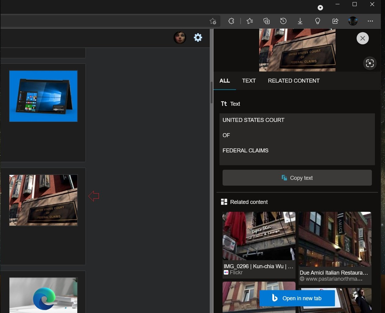 这意味着用户无需离开当前页面,就可以在必应中直接搜索图片,这与现有的 “在 Web 上搜索图像” 选项不同。后者会打开新标签页进行搜索。