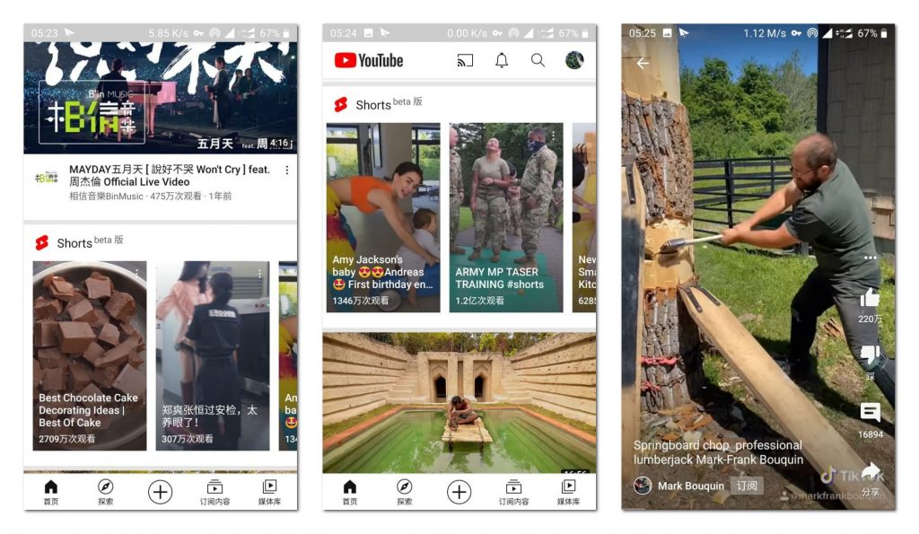 YouTube Shorts 整体来看和 TikTok 非常相近,它采用竖屏视频呈现。右侧提供点赞、评论或分享功能。并且可在屏幕上垂直滑动来切换视频。其视频创建界面也类似 TikTok 。