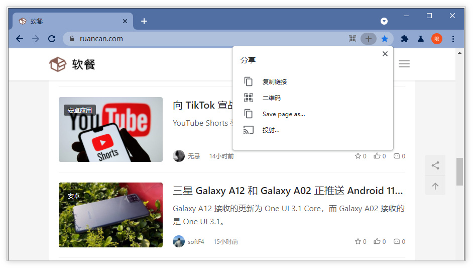 它在弹出的下拉菜单中提供了 “复制链接” 、 “二维码” 、 “页面另存为” 和 “投射” 等选项,以便用户快速访问。(下图)
