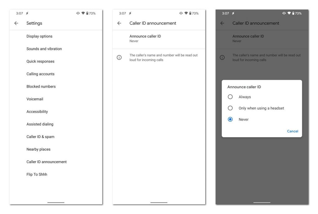 截屏显示,该功能被谷歌命名为 “来电播报”(Caller ID announcement)。在最新版中,这一选项已被移到了应用的 “设置” 页面。当你使用耳机时,可以轻触这个选项,以开启所有来电播报,或将其完全关闭。