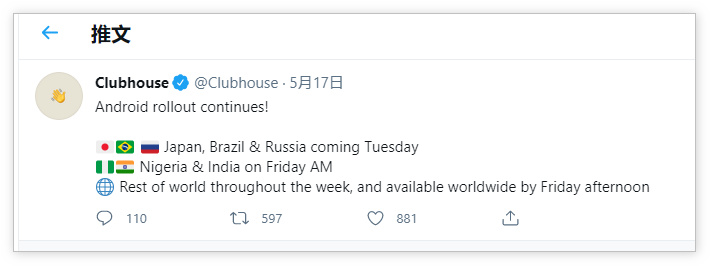 5 月 17 日,Clubhouse 在推特上针对多个国家和地区发布了安卓版的 Beta 测试时间表。