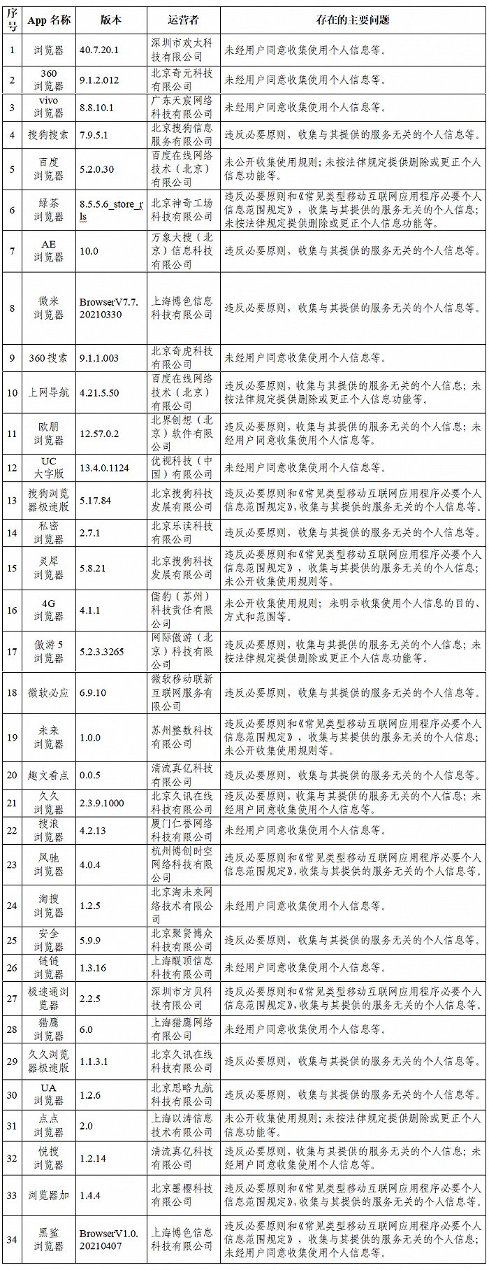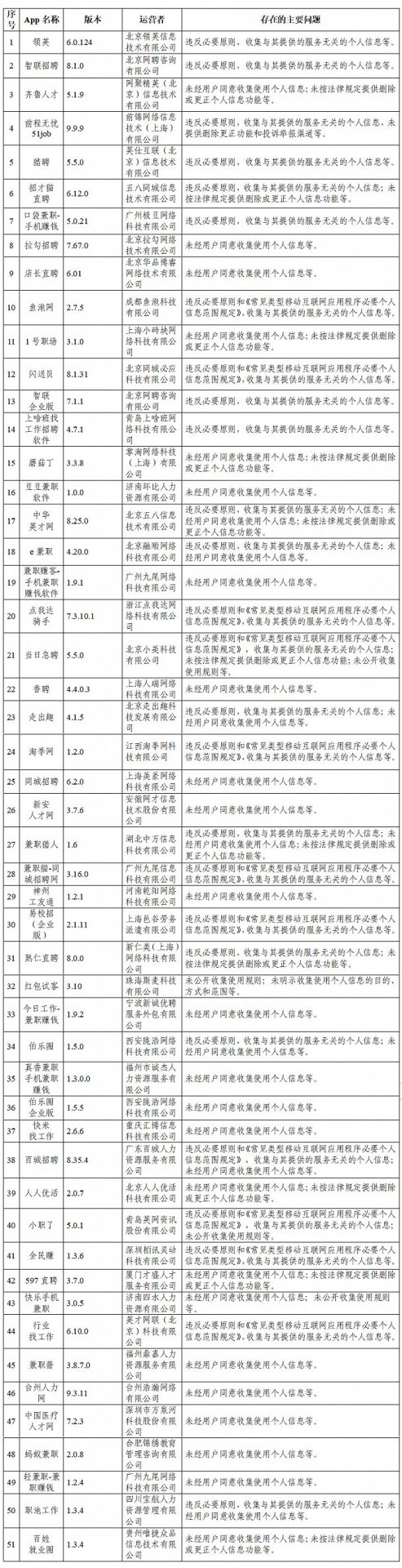 近期,针对人民群众反映强烈的 App 非法获取、超范围收集、过度索权等侵害个人信息的现象,国家互联网信息办公室依据《中华人民共和国网络安全法》《App 违法违规收集使用个人信息行为认定方法》《常见类型移动互联网应用程序必要个人信息范围规定》等法律和有关规定,组织对短视频、浏览器、求职招聘等常见类型公众大量使用的部分 App 的个人信息收集使用情况进行了检测。现将有关情况通报如下: