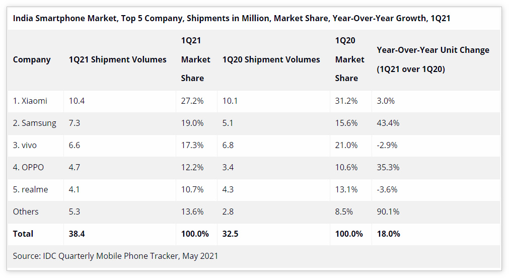 IDC 的报告显示,2021 年第一季度,小米印度以 1040 万台的出货量占领了印度 27.2%的市场份额。数据也显示,小米在印度的市场份额与 2020 年第一季度相比略有下降,但出货量已从 1,010 万台增加到 1,040 万台。