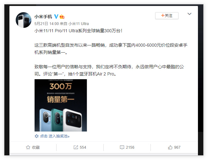 近日,小米还宣布,截至 2021 年 4 月,小米 11 、小米 11 Pro 和小米 11 Ultra 在全球销量超过 300 万台,但小米未透露每型号的销售数据。 2020 年底,小米 11 系列在国内发布,后于 2021 年 2 月在海外发布。