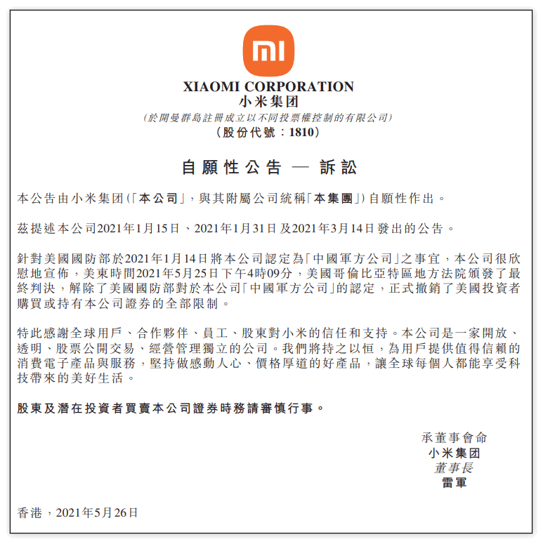 小米公司在向香港交易所提交的文件中称:“哥伦比亚特区美国地方法院发布了一项最终命令,撤消了美国国防部对该公司的指定为 CCMC 。” 撤销命令是在星期二下达的。
