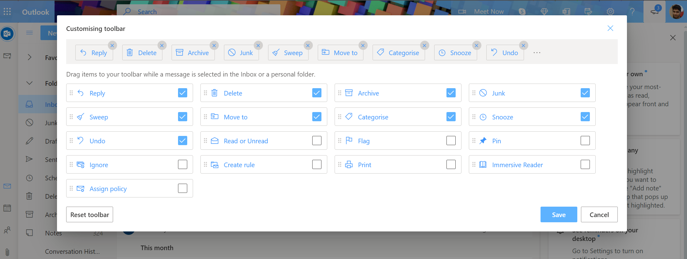 现在,Outlook 网页版允许用户从工具栏中添加或删除任何一个快速操作按钮。