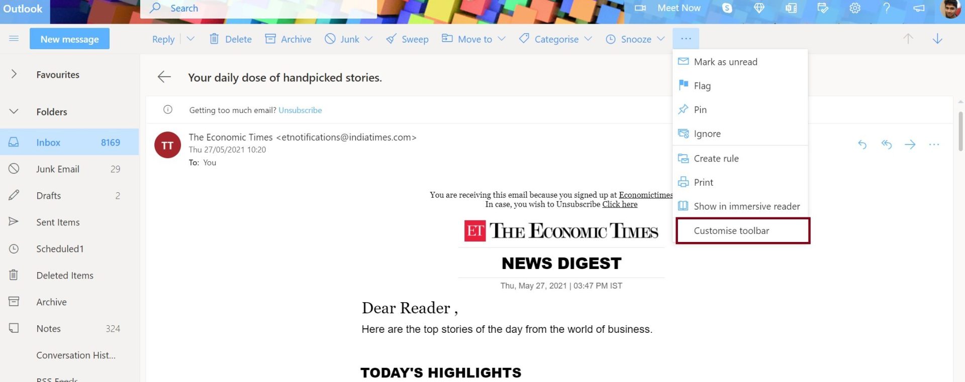 要自定义工具栏,首先用户需要打开一封电子邮件,然后单击工具栏上三点菜单。单击它将呈现全部的快速操作选项,其中包括 “自定义工具栏”(Customise toolbar)选项 ,点击即可开始设置。