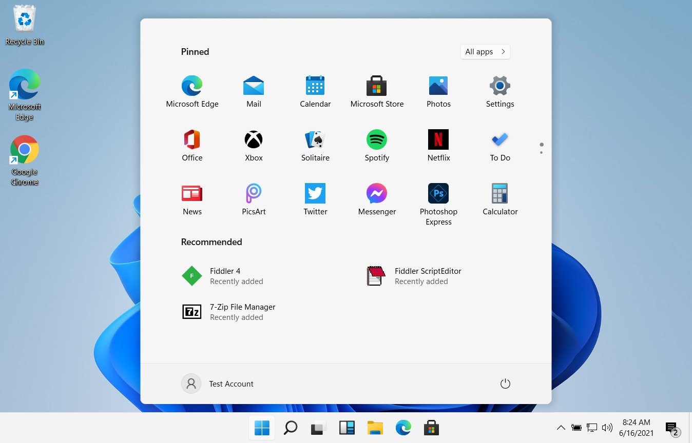 Windows 11 的开始菜单令人耳目一新,它显然借鉴了已宣告流产的 Windows 10X,采用了居中布局和浮动式的界面,如下图。