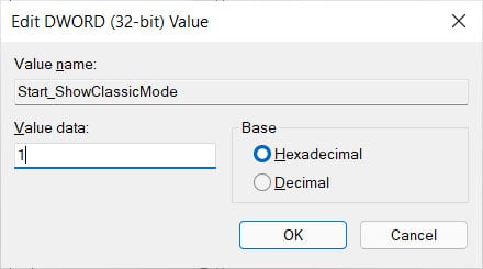 - 当 Start_ShowClassicMode 对话框打开时,在 “数值数据”(Value data)字段中输入 1,然后按 “确定”按钮。
