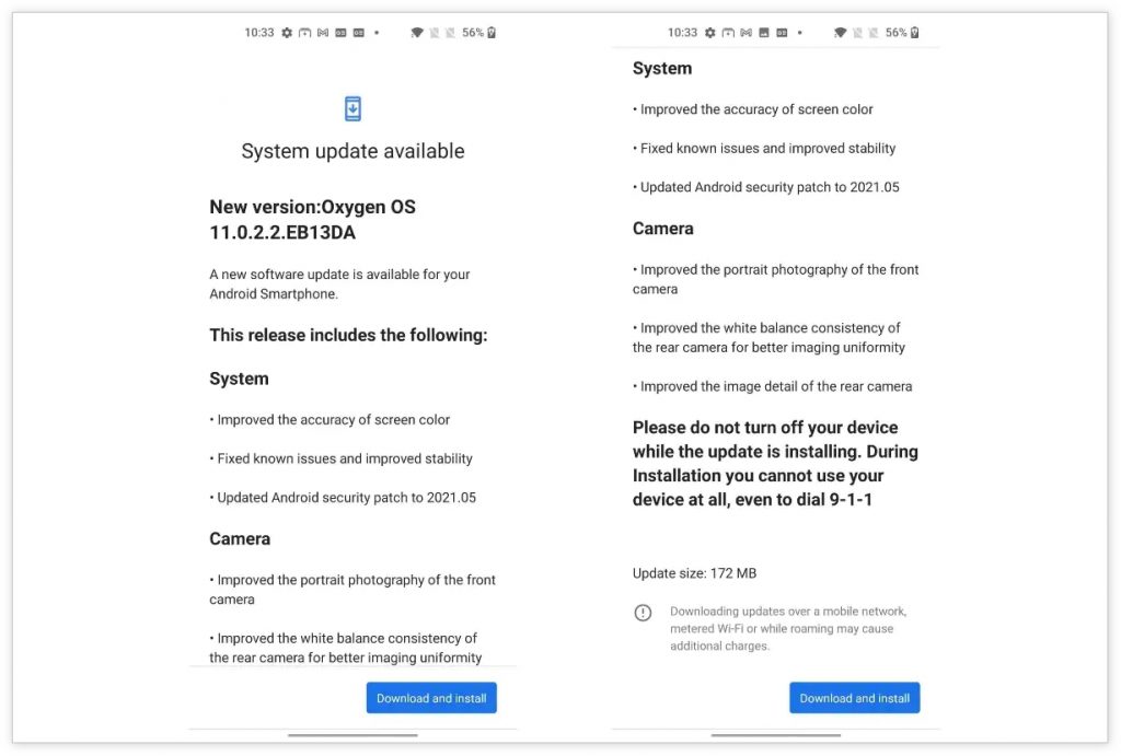 本次更新带来了 2021 年 5 月的 Android 安全补丁,并进行了一系列改进,包括更好的屏幕颜色准确性和改进的前置自拍人像摄影效果。更新日志显示,Nord CE 5G 的后置摄像头在白平衡一致性和图像细节方面也有改进。