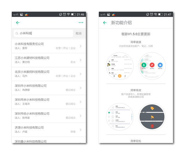 更为实用的功能可能算得上工商企业信息查询,输入关键词,你可以查询并了解客户公司的基本信息,以帮助你后续更顺畅的完成沟通。客脉发布了 iOS 版和安卓版,同时还拥有 PC 网页版。