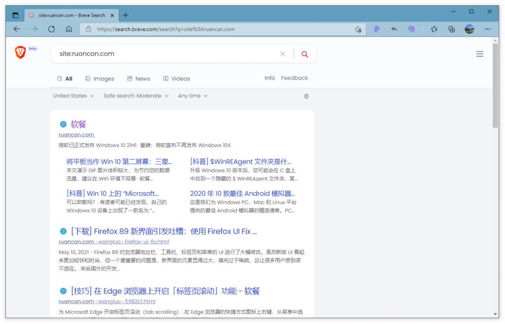 我们看到,Brave Search 已经开始索引包括软餐(ruancan.com)在内的各类站点的内容,且似乎有着较高的更新频率。