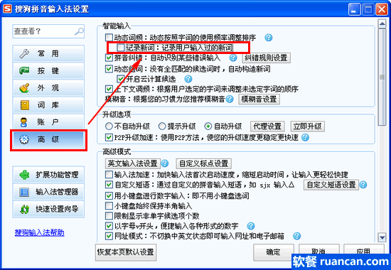 途径:在搜狗拼音输入法托盘上右键 -设置属性 – 高级 – 将 “记录新词: 记录用户输入过的新词” 前面默认的勾选取消掉。