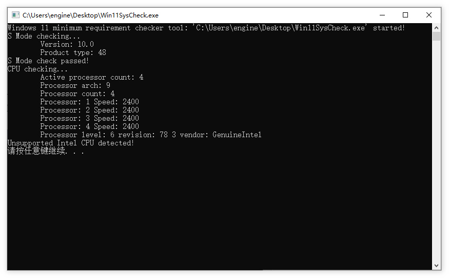如下图,Win11SysCheck 提示我们的测试设备不支持 Windows 11:“检测到不支持的英特尔 CPU” 。这和我们使用 WhyNotWin11 得出的检测结果一致。