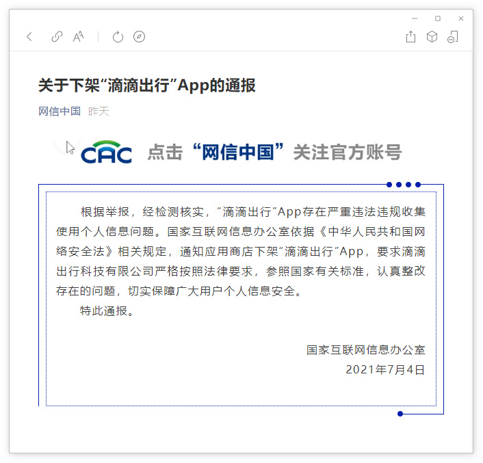 国家网信办通报下架 “滴滴出行”App:严重违法违规收集个人信息 安亚 • 2021-07-05 00:38 • 业界 软餐获悉,国家互联网信息办公室微信公众号 “网信中国”7 月 4 日发文称,根据举报,经检测核实,“滴滴出行”App 存在严重违法违规收集使用个人信息问题。国家互联网信息办公室依据《中华人民共和国网络安全法》相关规定,通知应用商店下架 “滴滴出行”App,要求滴滴出行科技有限公司严格按照法律要求,参照国家有关标准,认真整改存在的问题,切实保障广大用户个人信息安全。 本站电报频道 / 电报群 原文出处:网信中国,如若转载,须获得稿源授权。 应用商店滴滴滴滴出行 赞 (0) 安亚 0 0 生成海报 发表回复 您的邮箱地址不会被公开。 必填项已用 * 标注*昵称: *邮箱: 网址: 记住昵称、邮箱和网址,下次评论免输入 提交