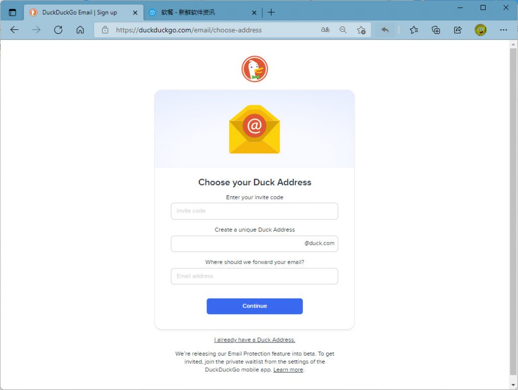 软餐(ruancan.com)实测发现,注册这项电子邮件保护服务需要输入邀请码。要获得邀请,用户需要从 DuckDuckGo 移动应用程序的设置中加入候补名单。