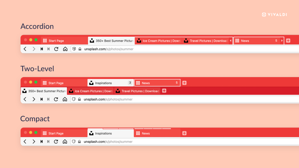 现在,Vivaldi浏览器提供了三种排列标签页的方式:紧凑、二级和手风琴。用户可在“设置”>“标签页” 中找到相关选项。