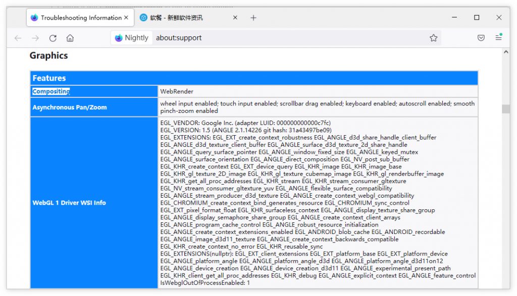 - 检查 Compositing 的值是否设置为 WebRender(上图)。如果设备的显卡支持,WebRender 会使用硬件加速进行渲染。如果不支持 GPU,则使用软件仿真。