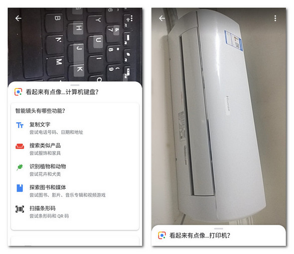 经过软餐的实际测试,Google Lens 拥有比较强大的物品识别能力(识字当然更不在话下),但仍有误差,例如下图,一台海信空调被识别成了打印机。