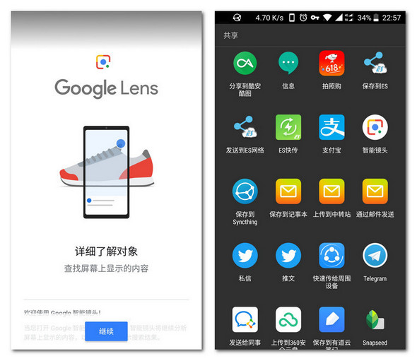 和此前的 1.0 版相比,1.1 版终于支持了应用间分享功能。它允许用户在其他 App 内将图片发送到 Google Lens,由 Google Lens 打开并识别。
