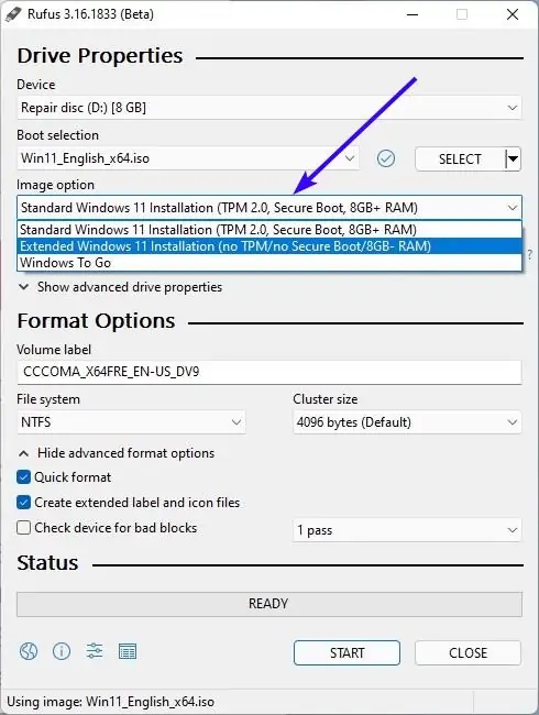 6. 之后,你将看到新的镜像选项菜单。它默认会显示标准 Windows 11 安装。选择第二个选项,即扩展 Windows 11 安装(无 TPM,无安全启动,8GB-RAM)。