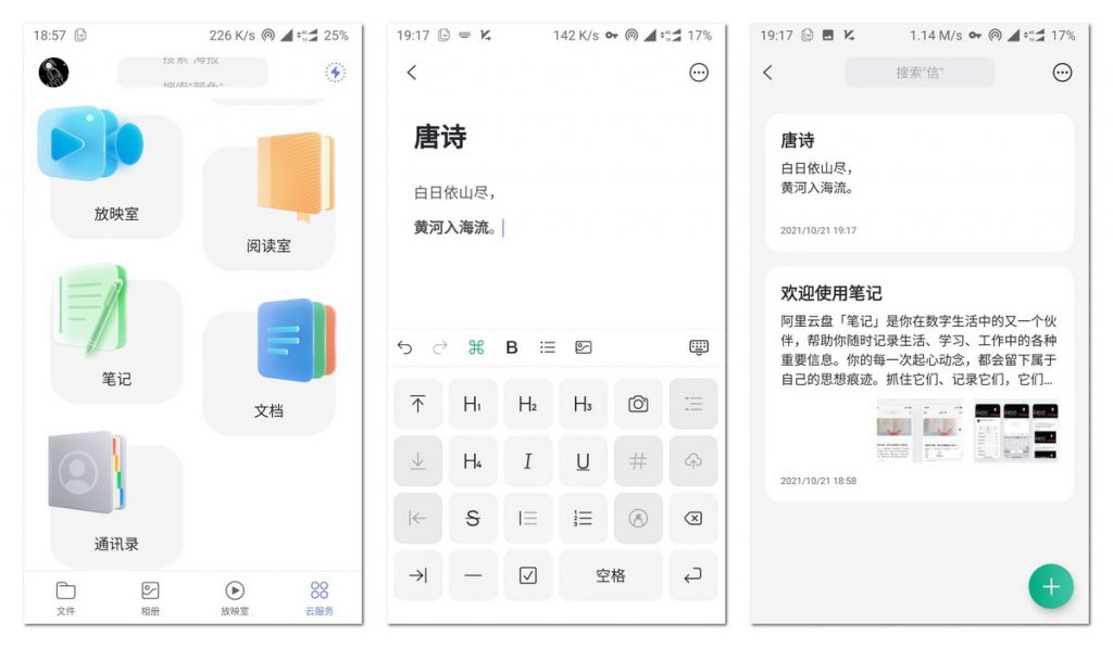 阿里云盘「笔记」提供了灵活强大的编辑器,支持多种文本和样式工具(H1-H4 标题样式、加粗、倾斜、下划线、删除线等),编辑器支持 markdown 语法。此外还能插入引用、列表、图片等内容,并且支持搜索、置顶、删除等操作。但经过软餐(ruancan.com)实测,尚不支持对笔记进行分享。