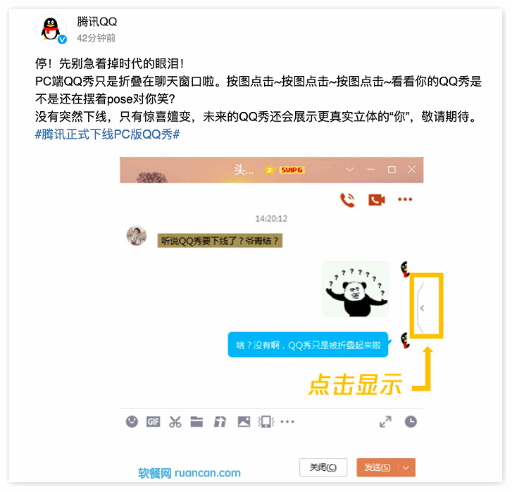 软餐获悉,腾讯 QQ 通过官方微博澄清 “QQ 秀下线” 消息时表示,PC 端 QQ 秀没有下线,目前只是折叠在聊天窗口。此前有网友称 PC 版 QQ9.5.2 版中 QQ 秀已经不见影踪,无法再看到自己的 QQ 秀形象,引发网友讨论和感慨。