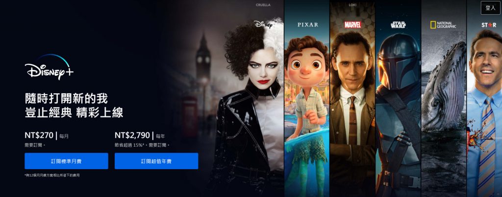 Disney+在台湾的订阅价格为新台币 270 元每月,年付价格为新台币 2,790 元,后者可省约两个月的费用。用户可在手机、平板、电脑、 PS4 、 PS5 、 Xbox One 以及电视上打开 Disney+,最多支持四台设备同时观看,下载设备限制数为 10 台,也支持最多 7 个账户和儿童模式。