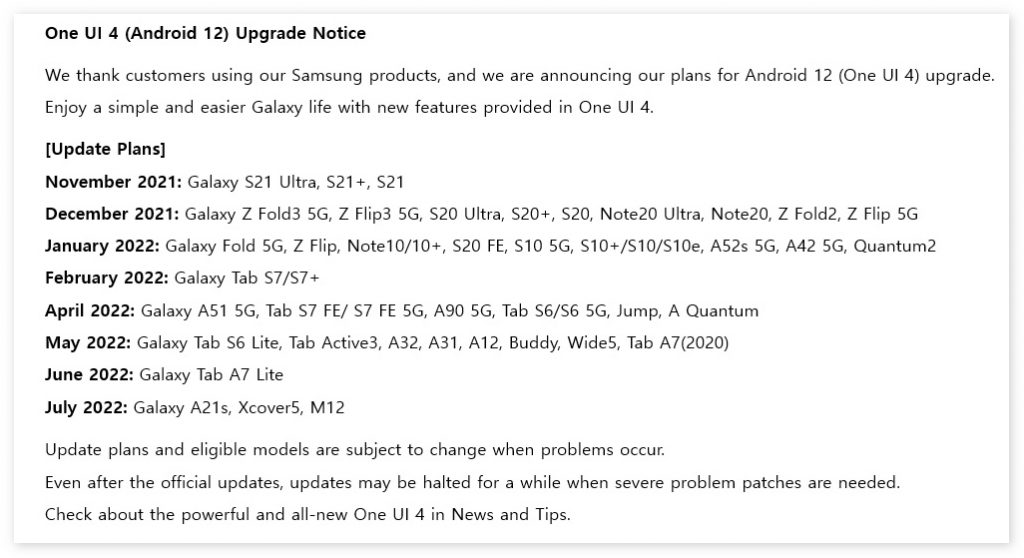这份通知显示,One UI 4.0 将于本月开始为 Galaxy S21 系列发布,随后是 Galaxy Z Fold 3 、 Galaxy Z Flip 3 、 Galaxy Note 20 系列、 Galaxy S20 系列、 Galaxy Z Fold 2 ,以及 Galaxy Z Flip 等设备。