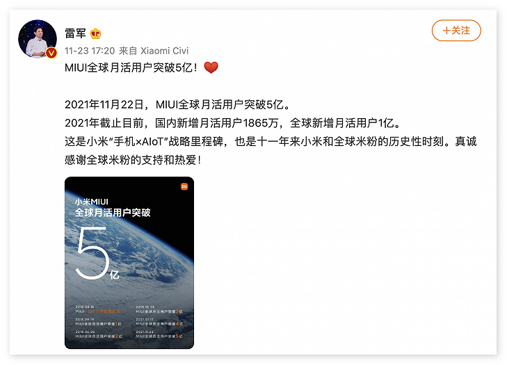 雷军称 MIUI 全球月活用户已突破 5 亿 志锋 • 2021-11-23 22:41 • 安卓 小米董事长兼 CEO 雷军今天通过微博宣布,MIUI 全球月活用户已突破 5 亿。 2021 年截止目前,MIUI 国内新增月活用户 1865 万,全球新增月活用户 1 亿。 本站电报频道 / 电报群 miui雷军 赞 (0) 志锋 0 0 生成海报 发表回复 您的邮箱地址不会被公开。 必填项已用 * 标注*昵称: *邮箱: 网址: 记住昵称、邮箱和网址,下次评论免输入 提交