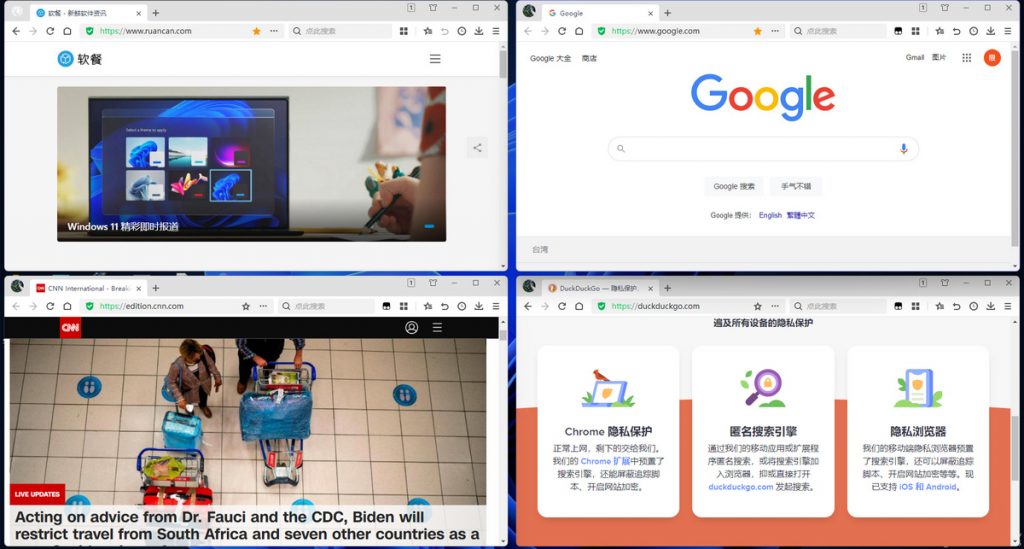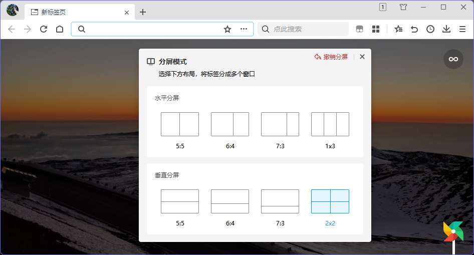 分屏模式提供了水平和垂直两种布局,允许用户将浏览器以预设的 5:5 、 6:4 、 7:3 、 1:3 等比例布局打开多个窗口,以同时浏览不同的页面。效果如下图。