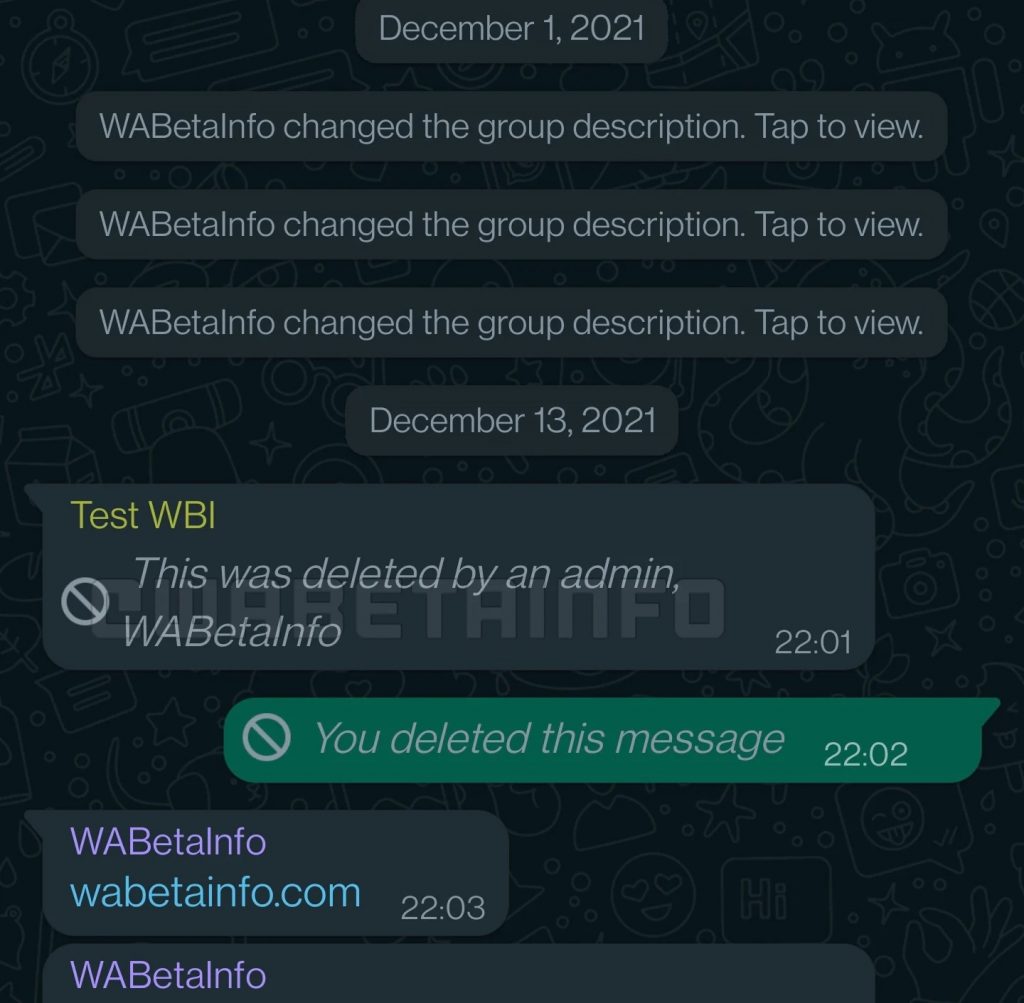 WhatsApp 扩大管理员权力,可删除任何群聊消息 瞻宇 • 2021-12-20 13:42 • 安卓应用 软餐获悉,即时通讯应用 WhatsApp 将扩大群组管理员的权力——它将允许管理员删除任何群组聊天消息,这包括其他群组成员发送的消息。管理员在删除某条群聊消息后,其他成员将看到相关注释信息。该功能在 WhatsApp 安卓 Beta 版 2.2.22.1.1 中已经推出。 暂不清楚这项功能推出的具体时间。 本站电报频道 / 电报群 WhatsApp即时通讯群聊 赞 (0) 瞻宇 0 0 生成海报 发表回复 您的邮箱地址不会被公开。 必填项已用 * 标注*昵称: *邮箱: 网址: 记住昵称、邮箱和网址,下次评论免输入 提交