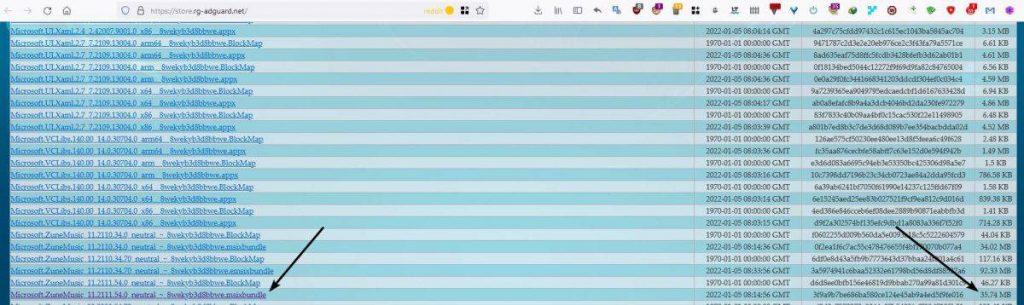 - 单击旁边的复选标记按钮继续,将出现一长串链接。查找名为 Microsoft.ZuneMusic_11.2111.54.0_neutral__~_8wekyb3d8bbwe.msixbundle 的文件,大小约 35 MB,并下载。