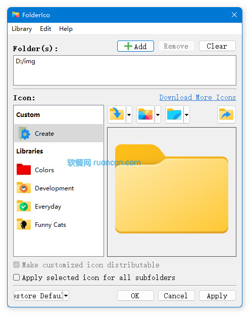 FolderIco 的使用非常简单,通过微软商店安装后运行,指定本地的文件夹,选择想要的颜色或图标即可快速应用修改。 FolderIco 同时允许用户导入自己设计的图标包。
