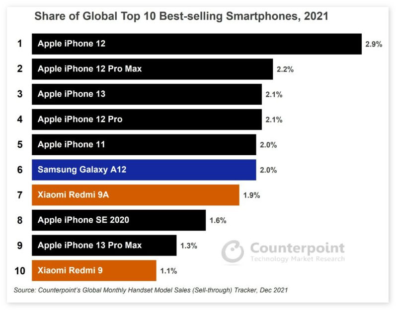榜单前五位分别被苹果的 iPhone 12 、 iPhone 12 Pro Max 、 iPhone 13 、 iPhone 12 Pro 和 iPhone 11 占据,前三名占苹果总销量的 41%;三星 Galaxy A12 排名第六,同时也是 2021 年最畅销的安卓智能手机。小米的预算型入门手机红米 9A 排名第七,红米 9 排在第十位。 Redmi 9 系列设备贡献了小米 2021 年总销售额的 22% 。而 iPhone SE 2020 和 iPhone 13 Pro Max 分别位居榜单第八和第九位。