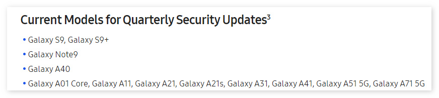 软餐访问三星官网看到,Galaxy S9 和 S9+仍被列入 “每季度更新一次” 的设备清单中(上图),这意味着它们后续可能会继续获得更新支持。