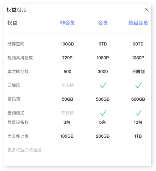 尽管目前在功能上,阿里云盘还没有百度网盘那么丰富,但会员及超级会员在用户最为在意的存储空间、文件上传限制等权益上更加慷慨,性价比十分突出。