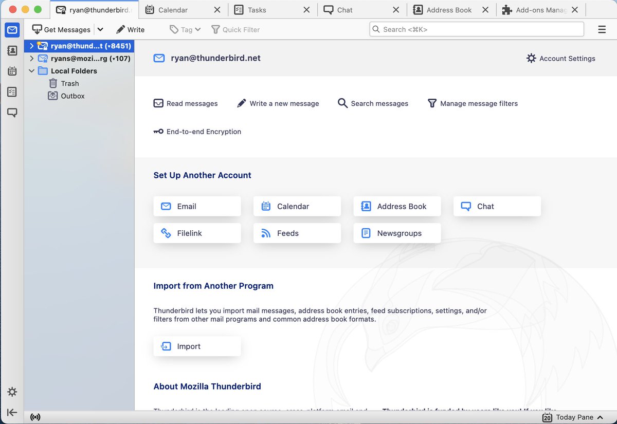 - 帐户设置中心。 Thunderbird 102 改进了辅助账户的设置体验。