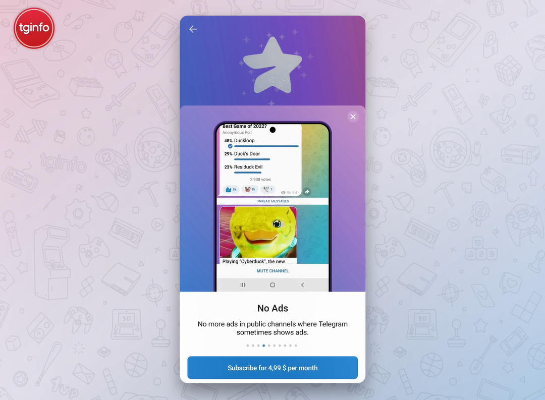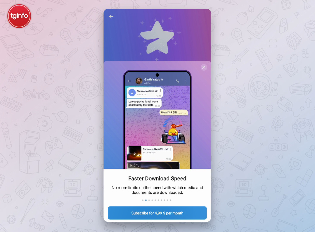 画面显示,Telegram Premium 付费订阅似乎将只提供一种计划,其售价为每月 4.99 美元,付费用户将获得以下功能。