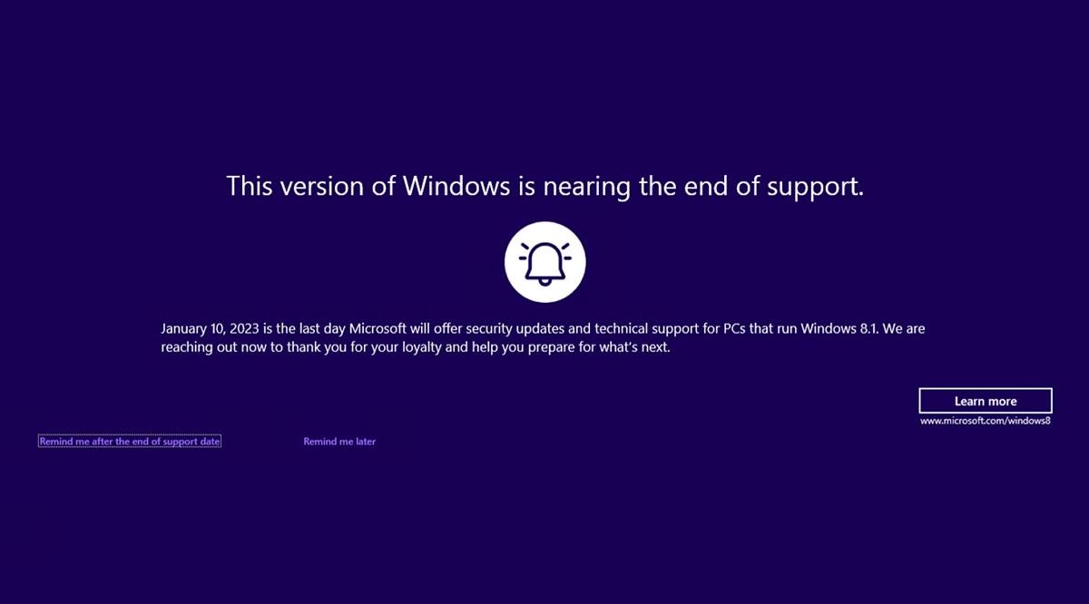 软餐获悉,微软已开始向 Windows 8.1 用户推送系统即将结束支持的通知——用户被告知,Windows 8.1 将在 2023 年 1 月 10 日获得最终更新,在此之后微软将停止对它的支持。收到此次的提醒后,用户可选择忽略提醒,在 2023 年 1 月真正结束支持时可再次收到提醒。