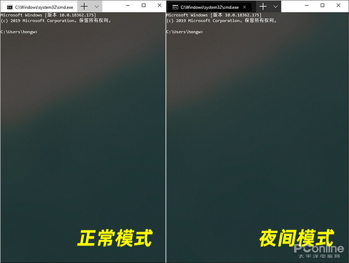 除多标签以外,新版命令行另一个比较明显的变化,是增加了 “亚克力” 特效支持。进入 CMD 后,你会明显看到背景增加了模糊效果,而不再是之前那种半透明风格。同时 “夜间模式” 也被一并整合在内,符合 UWP 的设计标准。不过目前亚克力特效还仅限于 CMD 模块,PowerShell 还没有加入。