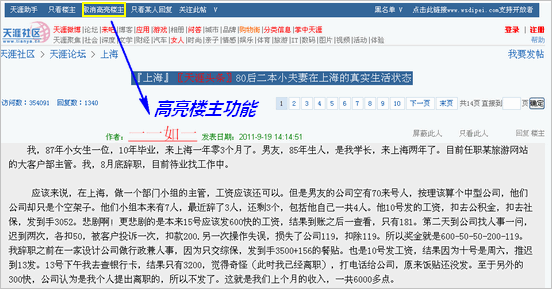 天涯应该算是国内人气最高的网络社区了,天涯上各种离奇情节、各种擦边原创,极大的满足了网友们的心理需求。但很多时候,楼主发表的帖子会很快被热情的网友回复帖淹没,这会给我们的阅读造成困难:要翻很久才能找到楼主的帖子。